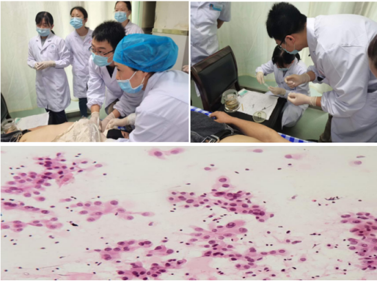 在超声定位引导下,肿瘤外科李程医师顺利完成甲状腺包块穿刺,病理科张薇医师在床旁完成穿刺液涂片固定,整个操作过程用时10分钟,1小时后病理诊断结果为甲状腺乳头状癌。两位医师干净利落完成操作,同时对县医院技术骨干进行示范带教。通过“传、帮、带”,为县医院培养了一批批技术骨干,真正将六合彩网站