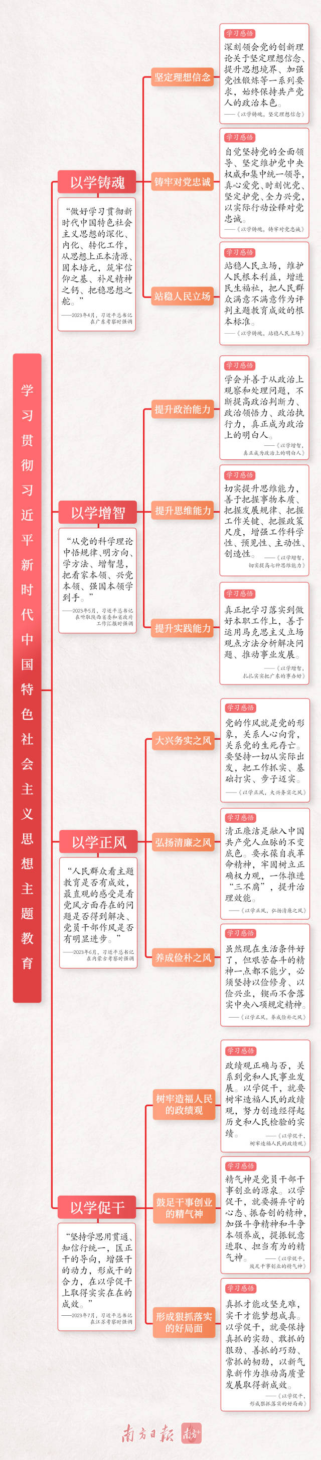 学习贯彻习近平新时代中国特色社会主义思想主题教育正在全党深入开展。2023年4月到7月,习近平总书记在广东、陕西、内蒙古、江苏四次调研中,分别对“以学铸魂”“以学增智”“以学正风”“以学促干”提出明确要求,一起来看思维导图学习重点。